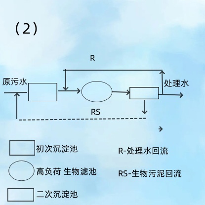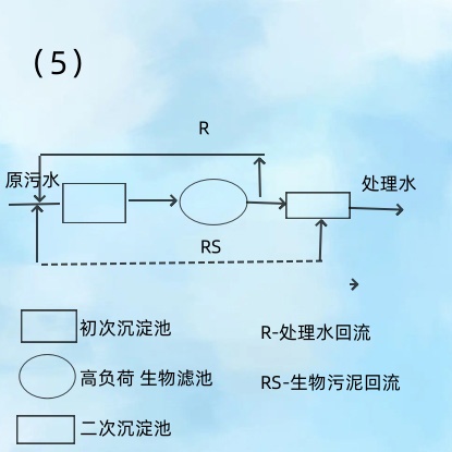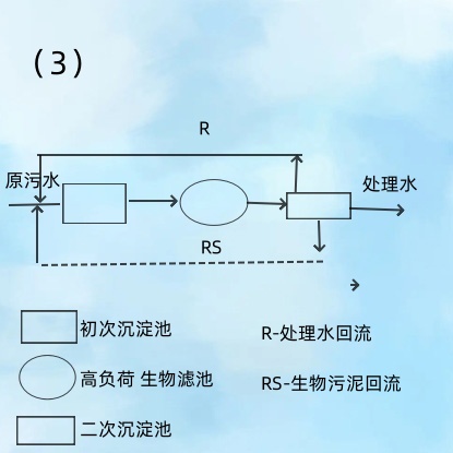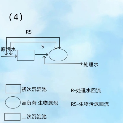 (1)是應(yīng)用比較廣泛的高負(fù)荷生物濾池處理系統(tǒng)之一,生物濾池出水直接向?yàn)V池回流;由二次沉淀池向初次沉淀池回流生物污泥。這種系統(tǒng)有助于生物膜的接種,促進(jìn)生物膜的更新。此外初次沉淀池的沉淀效果由于生物污泥的注人而有所提高。