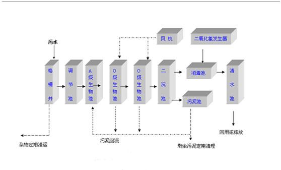 廢水經(jīng)隔油池隔除大部分浮油及剩飯殘?jiān)?,進(jìn)入調(diào)節(jié)池,在調(diào)節(jié)池內(nèi)均質(zhì)、均量后經(jīng)泵提升至A級生物池,在A級生物池段異養(yǎng)菌將污水中可溶性有機(jī)物水解為有機(jī)酸,使大分子有機(jī)物分解為小分子有機(jī)物,不溶性的有機(jī)物轉(zhuǎn)化成可溶性有機(jī)物,將蛋白質(zhì)、脂肪等污染物進(jìn)行氨化。在O級生物池段存在好氧微生物及消化菌,其中好氧微生物將有機(jī)物分解成CO2和H2O;在充足供氧條件下,硝化菌的硝化作用將NH3-N氧化為NO3-,通過回流控制返回至A級生物池,在缺氧條件下,異氧菌的反硝化作用將NO3-還原為分子態(tài)氮,接觸氧化池出水自流進(jìn)入沉淀池進(jìn)行沉淀,沉淀池上清液出水進(jìn)入清水池短暫停留,出水達(dá)標(biāo)排放。